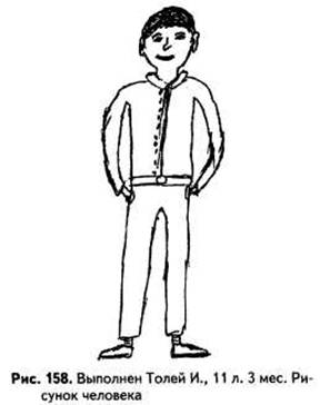 Стр. 137 На рисунке семьи животных одиннадцатилетнего Толи И. изображены очень чинные и благопристойные папа-лев и мама-слониха. Им противопоставлены дети, нарисованные в подчеркнуто свободных и даже развязных позах: сын-заяц и дочь-свинья (рис. 157). По поводу сына-зайца Толя сообщил, что он – «что-то вроде наркомана» (на рисунке он изображен со шприцем в руке). В реальной Толиной семье двое детей: сам Толя и его старший брат пятнадцати лет. На вопрос о том, кто из детей в изображенной им семье старший, мальчик указал на зайца. Это дает основания полагать, что именно в образе зайцаон отразил свое отношение к старшему брату, в то время как сам он изображен в образе дочери-свиньи (отношения старшинства в семье обычно более значимы, чем пол). Дети изображены на рисунке в экстравертных позах, с руками, отставленными в стороны. Родители же, хотя и имеют человеческие лица, но лишены рук или каких-либо других признаков, символизирующих направленность на общение. Это позволяет предположить, что Толя испытывает в семье сильный дефицит общения. Антисоциальная тематика – упоминание о наркомании – говорит о серьезных проблемах социализации. Не исключено, что старший брат Толи действительно употребляет наркотики, хотя родители этого не подтверждают. Если в рисунке все же отражена реальность, то это не отменяет вывода о нарушениях Толиной социализации. Социализированный вариант поведения в данном случае демонстрируют родители, которые отрицают наличие этой проблемы независимо от реального положения дел. |