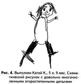 Стр. 19 Этот тест позволяет охарактеризовать эмоциональное состояние обследуемого более определенно, чем по свободному рисунку, в котором встречается воспроизведение прежних отрицательных переживаний, не отражающих данную ситуацию. Если же негативные переживания проявляются в «красивом» рисунке, где они противоречат инструкции, то можно полагать, что они актуальны для обследуемого в настоящий момент. Глава 2 РИСУНОК ЧЕЛОВЕКАВОЗРАСТНЫЕ ЗАКОНОМЕРНОСТИДОШКОЛЬНЫЙ ВОЗРАСТНа шестом году жизни ребенок овладевает представлениями о вертикали и горизонтали; если раньше он часто рисовал человека в наклонном положении, словно падающего, то теперь он начинает рисовать его стоящим строго вертикально. Последующее развитие рисунка человека состоит в переходе к изображению толщины рук и ног. Пятилетний ребенок рисует конечности двойными линиями. Руки по-прежнему изображаются от середины туловища; второстепенные детали обычно отсутствуют или они немногочисленны (рис. 3). |