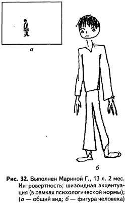 Стр. 37 Диагноз подтверждается наличием энуреза (недержания мочи), а также данными подробного психологического обследования. Рекомендовано обращение к врачу. Сходный тип штриховки (с особо сильным нажимом) наблюдался также на рис. 16 (зачернены волосы и ступня). Возможно, что и в этом случае имелась высокая эмоциональная напряженность, но об этом нельзя было говорить с уверенностью. Рисунок принадлежит мальчику с выраженной умственной отсталостью и выполнен на очень низком уровне. Не исключено, что штриховка с сильным нажимом появилась из-за нарушений регуляции движений, вызванных основным дефектом. СФЕРА ОБЩЕНИЯ ИНТРОВЕРТНОСТЬДля оценки устойчивых личностных особенностей, в частности тех, которые определяют сферу общения, большее значение имеют не формальные показатели в рисунке человека, а содержательные, т.е. способ изоб ражения отдельных частей человеческого тела и лица. Учитываются также общее впечатление, производимое рисунком, поза и выражение лица изображенного персонажа. На рис. 32 изображен грустный и очень одинокий человек. Его одиночество подчеркнуто горизонтальным расположением листа, который исходно был положен перед ребенком вертикально. Родители Марины обратились к психологу с жалобой на то, что у девочки нет друзей и подруг. В беседе Марина жалуется на чувство одиночества. Данные психологического обследования подтверждают наличие выраженной интровертности, неконформности, своеобразия мышления. Таким образом, можно говорить о шизоидной акцентуации, не выходящей за пределы психологической нормы. Для преодоления проблем общения рекомендовано участие в коллективной деятельности: занятия в кружке или студии (желательно с художественной направленностью), посещение психологической группы общения. |