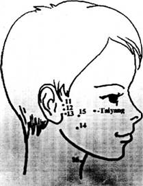 Рис.1 Местоположение биологически активных точек на лице и шее