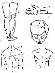 Стр. 167 При заикании точечный массаж проводят ежедневно в течение 12 дней. После семидневного отдыха курс повторить. Последовательно провести 3—4 курса. Ребенок во время массажа должен быть спокойным, расслабленным. Избегать острой пищи, крепких напитков: чая, кофе, так как они возбуждают нервную систему, снижают эффект воздействия. Натощак или сразу после еды массаж проводить не рекомендуется. 3.9.4. Точки массажа при забывчивости, рассеянности, невозможности сосредоточитьсяПри коррекции этих недостатков применяется тонизирующий метод: прием глубокого надавливания, вибрации, вращения по часовой стрелке в течение одной минуты. Курс рассчитан на 12 дней, проводится ежедневно, после семидневного отдыха курс повторяют. Точки 1, 3, 5 — симметричные, массировать поочередно справа и слева в положении сидя, рука лежит на столе ладонью вверх (рис. 3.6, 3.7). Точки 2, 4 — симметричные, массировать поочередно справа и слева в положении сидя, рука лежит на столе ладонью вниз. Точка 6 — симметричная, массировать одновременно с обеих сторон в положении сидя, согнув ноги в коленях. Точка 7 — несимметричная, массировать в положении сидя, слегка склонив голову вперед. Рис. 3.6. Точечный массаж при коррекции забывчивости, рассеянности Рис. 3.7. Точечный массаж при невозможности сосредоточиться |