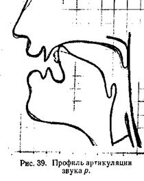 Положение губ и расстояние между резцами зависят от следующего звука. Язык принимает форму ложечки: своими боковыми краями он прилегает к верхним коренным зубам, передний край языка поднят к альвеолам и дрожит под напором выдыхаемого воздуха. При произнесении ре, ри (перед гласными переднего ряда) спинка языка поднимается выше, а передний край передвигается вперед, ближе к верхним резцам; в результате получается смягченное р. Мягкое нёбо поднято и закрывает проход воздуха в нос. Голосовые складки сомкнуты и вибрируют (рис. 39). Можно видеть положение губ, верхний и нижний ряд зубов, положение и работу языка (последнее — при несколько запрокинутой голове). На поднесенной ко рту руке можно ощущать толчкообразное движение выдыхаемого воздуха; приложенной к гортани рукой можно воспринимать вибрацию, обусловленную работой голосовых складок. Звук р хорошо воспринимает на слух большинство детей, имеющих остатки слуха. Для некоторых детей звук р не представляет трудностей. Зато другие дети оказываются в состоянии произнести звук р лишь после длительных систематических упражнений. В связи с этим в период первоначального обучения индивидуальная работа над звуком р должна планироваться задолго до того, как начинают проводиться первые уроки по развитию речи и обучению грамоте, имеющие своим содержанием слова, которые включают звук и букву р. Следует также упомянуть о том, что потребность в употреблении некоторых слов со звуком р (например, числительных — три, четыре) заставляет включить их в устную речь детей, не дожидаясь того времени, когда будет усвоено произношение этого звука. В этом случае дети могут временно пользоваться фрикативным р (см. ниже) или заменять р звуком л (слова три, четыре звучат как тли, шетыле). Начинать постановку звука р следует с подражания. Ученику предлагается послушать, как звучит р, и рассмотреть положение и работу языка. Чтобы облегчить последнее, учитель демонстрирует артикуляцию звука при несколько открытом рте. |