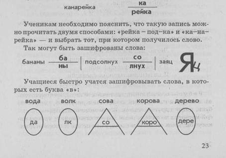 Стр. 19 Так же можно зашифровывать слова ве-точка, у-точка, кол-ос, гвозди-ка, неза-будка, стре-коза, су-репка, во-рот-а, нос-ки, вол-осы, мет-ель и т.п. Отдельные слова (буквы, рисунки) могут стоять друг за другом, одно внутри другого, друг над другом и т. д. В этих случаях при разгадывании ребуса нужно читать предлоги («под», «на», «за», «над», «в»). Этим способом можно зашифровать практически любое слово, в котором есть такие слоги и буквы. Например: Если перед рисунком стоит запятая, то в соответствующем слове не произносится первая буква. Запятая после рисунка означает, что не произносится последняя буква. Две запятые показывают, что не читаются две буквы и т.д. Если около рисунка есть перечеркнутая буква, то она не читается, если рядом стоит другая буква, то ею надо заменить зачеркнутую. Например: Цифры около слова или рисунка показывают, что буквы надо называть в том порядке, в каком поставлены цифры. Например: · Мышка - 4,5,1,2,3 (камыш) · Мошкара - 6,2,1,5,3,4,7 (ромашка) · Колос - 5, 2, 1,4, 3 (сокол) Следует отметить, что ребус требует особого внимания учителя как наиболее сложный вариант дидактической игры. Учащиеся должны хорошо видеть и различать буквенный и звуковой состав слова, определять и удерживать в памяти части слов, отделяя или присоединяя их к слову. Поэтому обучать разгадыванию ребусов нужно постепенно. Первые ребусы целесообразно разбирать вместе с детьми, записывая слова на доске и выделяя этапы членения слова. Эти сложные логические операции могут самостоятельно выполнять далеко не все дети с отклонениями в развитии даже после тщательного и подробного объяснения. Правила, которыми надо руководствоваться при разгадывании ребусов, учащиеся могут записать в тетрадь. Впоследствии сильные ученики пользуются этими записями для | Реклама | ||