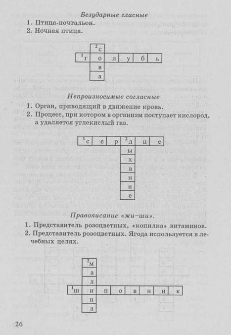 Практика показывает, что систематическое отгадывание кроссвордов уменьшает количество детских ошибок. Так, например, ученики часто затрудняются в написании мягкой шипящей в конце слова, добавляя мягкий знак в существительные мужского рода. При заполнении кроссворда такие ошибки исключаются. Ученик не может написать «лещ» с мягким знаком, так как на это слово отведено лишь три клеточки. |