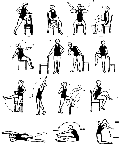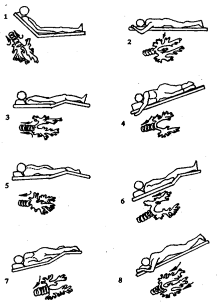 Стр. 201 Рис. 81. Дренирующие положения тела при патологии легочных зон: 1 — апикальных сегментов верхних долей; 2 — верхних сегментов нижних долей; 3 — передних сегментов верхних долей; 4 — боковых базальных сегментов нижних долей; 5 — задних сегментов верхних долей; 6 — переднебазальных сегментов нижних долей; 7 — язычковых сегментов; 8 — заднебазальных сегментов нижних долей Рис. 82. Примерный комплекс ЛГ при бронхоэктатической болезни Массаж при бронхоэктатической болезни. Проводится на грудной клетке (особенно дыхательной мускулатуре), животе и ногах (начиная с проксимальных отделов). Используют приемы: поглаживание, растирание, разминание и вибрацию. Массаж проводится в положении лежа на животе (при массаже воротниковой области и спины) с опущенной головой и несколько приподнятым изножием кушетки, а при массаже грудной клетки следует приподнять изголовье. Для лучшей дренажной функции бронхов рекомендуется вибрационный и перкуссионный (в проекциях бронхов) массаж. Продолжительность процедуры 8—12 мин. Курс 15—20 процедур. После массажа полезна оксигенотерапия (вдыхание увлажненного кислорода или прием кислородного коктейля). В год проводится 3—4 профилактических курса массажа. |