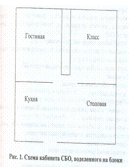 Стр. 13 3. Оснащение занятий по социально-бытовой ориентировкеДля коррекционных занятий по СБО необходимо оборудовать специальные помещения — кабинеты. Именно в них целесообразно сконцентрировать весь дидактический материал и оборудование, необходимые для эффективного изучения программного материала. Для качественного проведения занятий по СБО, для выработки предусмотренных программой навыков необходим комплекс помещений, то есть одной, даже очень большой комнаты, как бы хорошо она ни была оборудована, для выполнения программных требований по СБО недостаточно. К сожалению, в большинстве школ удается выделить только одну комнату под кабинет СБО, но она должна быть большой, чтобы ее можно было перегородками разделить на блоки (например, так, как показано на рис. 1). Оборудование помещений для занятий по коррекционному курсу СБО. Класс для занятий по СБО: § столы для учащихся; § стол для учителя; § стулья; § классная доска; § шкафы закрытые; § шкафы открытые; § шкафы застекленные; § настольные лампы; § лупы различной модификации (в том числе стационарные); § стенды; § домашняя аптечка; § набор столярных инструментов: отвертки, молоток, гвоздодер плоскогубцы, кусачки; § телевизор цветной; § видеоплейер; § зеркало; § видеозаписи способов выполнения различных предметно практических действий, овладение которыми предусмотрено программой по СБО; § методическая литература для учителя; § швейные принадлежности (нитки, пуговицы, ножницы, иголки, швейные машинки и т.п.); § наглядные пособия к различным темам курса СБО. Гостиная: |