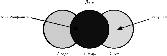 Стр. 12 Более того, наблюдения за конфликтами детей во время игровой деятельности позволяют выдвинуть предположение о том, что каждый ребенок имеет собственный круг игрушек, которые он включает во внутренние границы «Я». Избирательность ребенка в отношении игрушек очевидна и представляет сама по себе некоторую диагностическую и психотерапевтическую ценность – но не об этом сейчас речь. По нашему мнению, конфликты между детьми, связанные с обладанием вещами и игрушками, возникают , когда эти границы пересекаются, т.е. несколько детей «кладут глаз» на одну и ту же игрушку или один из детей пытается расширить свои границы путем экспансии (захвата) чужих игрушек. Подтверждением могут стать результаты длительного наблюдения за тремя мальчиками 2, 4 и 7–ми лет. Было замечено, что наибольшее число конфликтов, связанных с агрессивным поведением, наблюдалось между младшим, старшим и средним ребенком, в то время как между младшим и старшим конфронтация была минимальна. Обратил на себя внимание и тот факт, что конфликты возникали только по поводу обладания определенными игрушками. Удивительно, что были игрушки, вокруг которых совершенно не возникало конфликтов. Эту ситуацию можно проиллюстрировать рисунком (Рис. 1).