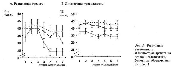 Стр. 6 Наиболее существенно различаются показатели психического состояния и некоторых личностных особенностей. У военнослужащих группы коррекции и контрольной группы оказались выше фоновые величины РТ и ЛТ, которые, хотя и снижались к окончанию исследования, но оставались значимо больше (р < 0,05) аналогичных показателей у военнослужащих группы сравнения (рис. 5). Высокий уровень НПУ обусловил и исходно большие показатели ВВС (1,57 ± 0,86 усл.ед. у военнослужащих контрольной группы и группы коррекции и 0,22±0,13 усл.ед. - у группы сравнения). Величина БВС снижалась к последнему этапу исследования, однако, у контрольной группы она оставалась значимо выше (р<0,05), чем у остальных групп. Обращает на себя внимание тот факт, что у группы коррекции уровень баланса вегетативной системы (БВС) на втором — четвертом этапах исследования статистически не отличался (при р < 0,05) от такового, определявшегося для группы с хорошей НПУ (рис. 6 А ). Значимые различия (р < 0,05) определялись и для таких характеристик психического состояния как концентричность-эксцентричность (КЭ) и баланс личностных свойств (БЛС) (рис. 6 Б,В). Контрольной группе оказалась присущей более выраженная эксцентричность, которая постепенно возрастала в процессе военно-профессиональной адаптации. Это может свидетельствовать о более выраженном интересе матросов, отнесенных к этой группе, к окружающей среде как к источнику получения помощи. Этот интерес «не угасал» до последнего этапа исследования, что может указывать на незавершенность процесса социально-психологической адаптации к условиям воинской службы. Для группы коррекции подобная динамика оказалась не характерна. К 7 этапу исследования величина КЭ этой группы практически не различалась (р < 0,05) с величиной КЭ матросов группы сравнения. У контрольной группы и группы коррекции оказались менее сбалансированы личностные свойства по сравнению с группой сравнения (рис. 6) как в начале исследования, так и на его протяжении. |