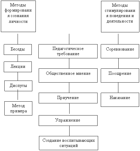 Стр. 104 Таким образом, педагогическую технологию можно определить как запрограммированный (алгоритмизированный) педагогический процесс, гарантирующий достижение спроектированных образовательных целей. Педагогических технологий может быть много: в зависимости от назначения педагогических систем, от исходных научных педагогических, дидактических, методических концепций, от целевых установок разработчиков и т.д. О соотношении понятий «дидактика», «методика», «педагогическая система», «педагогическая технология». Дидактика является общей теорией обучения, рассматривая всю совокупность проблем целей, содержания, форм и методов преподавания и учения, средств обучения. Методика – это «частная дидактика», т.е. теория обучения конкретному курсу, предмету. Та или иная конкретная педагогическая система строится, проектируется на основе конкретизации положений дидактики, методики применительно к данным конкретным целям и условиям образовательной деятельности. Педагогическая технология является процессуальной подсистемой педагогической системы. Часто используется в последнее время понятие «педагогическая техника». Термин «техника» выступает здесь в исходном значении, которое он имел ранее в русском языке – как искусство, ремесло, умелое выполнение чего-либо. Педагогическая техника – это совокупность умений педагога, позволяющих ему реализовать разработанную технологию. Педагогическое проектирование и педагогические технологии – это сравнительно новые подходы в педагогике, их детальная разработка и конкретизация еще впереди. Таблица 6.Методы воспитания