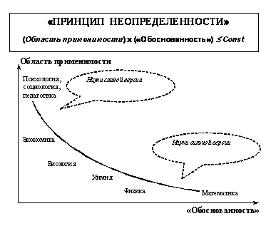 Стр. 130 Сказанное вовсе не означает, что развитие невозможно – каждое конкретное исследование является продвижением либо в сторону повышения «обоснованности», общности, либо/и расширения области применимости (адекватности). Ведь вся история развития науки в целом является иллюстрацией сдвига кривой, приведенной на Рис. 8, вправо и вверх (увеличением константы, фигурирующей в правой части неравенства)! Рис. 8. Иллюстрация «Принципа неопределенности» Возможно и другое объяснение – «ослабление» наук происходит по мере усложнения объекта исследования. С этой позиции можно сильные науки назвать еще и «простыми», а слабые – «сложными» (по сложности объекта исследования). Условно, граница между ними это – живые системы (биология). Изучение отдельных систем организма (анатомия, физиология и т.п.) еще тяготеет к сильным наукам (эмпирика подтверждается повторяемыми опытами и обосновывается более «простыми» науками – биофизикой, биохимией и т.п.), поэтому на ее базе возможны и формальные построения, как в физике и химии. Далее при изучении живых систем опыты в классическом понимании (воспроизводимость и др.) становятся все более затруднительными. А затем, при переходе к человеку и социальным системам, и вовсе становятся практически невозможными. Вернемся к более подробному описанию различных вариантов определения предметной области обобщающего исследования. Здесь можно попробовать подвести определенную типологию. Воспользуемся опять аналогией из теории множеств – диаграммами Эйлера-Венна (см. Рис. 9, на котором затенены « новые»предметные области). Здесь возможны следующие варианты: Случай а). Отдельное множество (аналог – новая предметная область). Данный вариант – появление абсолютно новой предметной области – встречается достаточно редко (обычно исследователь, в силу своего образования, принадлежности научной школе «зашорен»), однако именно этот вариант может привести к революционному появлению новых научных направлений; |