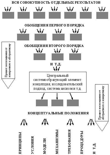 Стр. 155 По завершении этапа индукции – определения и формулирования центрального системообразующего звена – концепции, исследовательского подхода, системы аксиом и т.п., наступает дедуктивный процесс – конкретизации – восхождения от абстрактного к конкретному. На этом этапе формулировка концепции развивается, разворачивается в совокупности принципов, факторов, условий (групп условий), моделей, механизмов и т.д. Иногда, если проблема исследования расчленяется на несколько относительно независимых аспектов, концепция развивается в несколько концептуальных положений – а те уже, далее развиваются в совокупности принципов и т.п. В свою очередь, допустим, принципы могут развиваться в классы моделей, типы задач и т.д. Так выстраивается логика, логическая структура теории. Этот процесс представлен на Рис. 10. Эту схему исследователю чаще всего приходится циклически проходить несколько раз, проверяя и перепроверяя, уточняя логику своего исследования. Рис. 10. Построение логической структуры теории В довольно-таки обширной литературе по гносеологии авторы не нашли какого-либо иерархического упорядочения структурных элементов теории. К примеру, что выше (ниже) по уровню абстракции (конкретизации) – принцип или модель? правило или требование? механизм или процедура? и т.д. Так что, очевидно, исследователь имеет возможность самостоятельно выстраивать их иерархию в соответствии с решаемыми в своем исследовании задачами (естественно в соответствии с традициями той научной организации, где он работает).