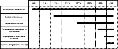Стр. 288 Рис. 28. Рис. 28. Проектное и процессное представления деятельности (приоритет процесса) Иллюстрацией этой тенденции является смещение акцентов в теории управления проектами с проблем управления отдельными проектами на проблемы управления портфелями проектов – см. Рис. 29. Рис. 29. История развития теории управления проектами Диалектическая смена акцентов с проекта на процесс и наоборот (на качественно новом уровне) как раз и характеризует один из аспектов смены организационных культур (см. Табл. 1 и Табл. 11). Табл. 11. Смена организационных культур
