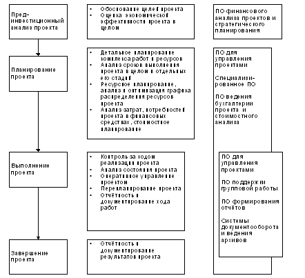 Стр. 298 Структуру интегрированной информационной системы поддержки принятия решений во многом определяет структура принятых в рамках проекта и организации процессов управления. Как следствие, она может быть структурирована по: этапам проектного цикла; функциям; уровням управления. На Рис. 32 показан обобщенный жизненный цикл проекта и управленческие функции, связанные с различными стадиями и этапами проекта. Для поддержки различных управленческих функций используется разное информационное и программное обеспечение (ПО). Рис. 32. Типы программного обеспечения для различных этапов проекта Для описания и анализа проекта на прединвестиционной стадии применяется специализированное ПО финансового анализа проектов, которое позволяет выполнить оценки основных показателей проекта в целом и обосновать эффективность капиталовложений. Для детального планирования и контроля графика выполнения работ, отслеживания ресурсов и затрат проекта необходимо использовать ПО для управления проектами. На стадии выполнения проекта необходимо обеспечить сбор фактических данных о состоянии работ, оптимально представить их для анализа, обеспечить обмена информацией и взаимодействие между участниками проекта. Для выполнения этих функций применяется ПО для управления проектами, ПО поддержки групповой работы, документооборота и формирования отчетов. Основными функциональными элементами интегрированной информационной системы поддержки принятия решений на стадии выполнения проекта являются: модуль календарно-сетевого планирования и контроля работ проекта; модуль ведения бухгалтерии проекта; модуль финансового контроля и прогнозирования. Важнейшим компонентом интегрированных информационных систем поддержки принятия решений являются системы управления базами данных. Их основными функциями являются поддержка целостности, защищенности, архивации и синхронизации данных в условиях многопользовательской работы. Более подробное представление о современных методах и средствах автоматизации управления проектами можно получить в [46, 143, 243]. |