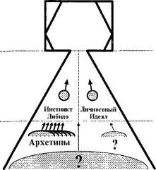 Стр. 128 Резюме: Быть устремленным «ввысь» — полезно для организма ЗаключениеСледуя схеме (Рис. 8), позвольте напомнить о главном из первой части и коротко остановиться на содержании части второй. Рис. 8 Сначала мы рассмотрели, как на основе Идеи спонтанной активности возникла концепция «бессознательного». Исходя из трех принципов причинности, как критериев трактовки сферы «бессознательного», мы выделили три Силы и изобразили их на схеме «сцена-подвал»: Либидо (Фрейд), «Личностный идеал» (Адлер) и Архетип (Юнг). Подавление этих Сил мы трактовали как нарушение трех принципов причинности, в результате чего возникают три типа невроза: по Фрейду (подавление Либидо), по Адлеру (подавление Личностного идеала) и по Юнгу (подавление Архетипа). Из схемы видно, что три классические трактовки основных Сил «бессознательного» лишь частично удовлетворяют трем принципам причинности. В этой связи логично задать вопрос, не существует ли концепций, которые более полно удовлетворяют этим принципам, ибо сама схема (подобно таблице Менделеева) подсказывает, что должен существовать Суперархетип (знак «?», внизу) и, если существуют животные надындивидуальные Силы, то должны существовать и духовные надындивидуальные Силы (знак «?», справа). Во второй части мы начнем построение системной концепции индивидуальности с того, что, исходя из трех принципов причинности, сформулируем критерий совместимости и выделим на его основе четыре основные аспекта индивидуальности: духовности, личности, характера и темперамента. Несмотря на то, что обсуждение концепций характера и темперамента не вошло в книгу, тем не менее, рассмотрение Сил, образующих духовность и личность, завершит логику трактовки («содержательных») Сил «бессознательного». Для того, чтобы найти «недостающие элементы» схемы «сцена-подвал», будут рассмотрены концепции духовности В. Франкла и Д. Андреева, и — личности Э. Шпрангера и К. Роджерса. |