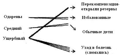 Стр. 74 Второй причиной отказа от биологического принципа «выжить и размножиться» было знакомство Адлера с «дьяволами отваги» циркачами, которые, как правило, были коротышками и имели многочисленные физические недостатки. Но их творческое продвижение к профессиональному совершенству достигалось тем, что ограничения в каких-то одних группах мышц они компенсировали мощным развитием других групп мышц и тренировкой общей физической ловкости (излаг. по [8, с. 16]). Свой отказ от «социального дарвинизма» Адлер выражает словами: «Никакое несовершенство органов не влечет за собой ошибочного стиля жизни. Мы никогда не найдем двух детей, чьи железы одинаково повлияли на них. Мы не можем судить по телу, будет ли развитие души хорошим или плохим» (цит. по [8, с. 22]). Итак, развитие идеи о перекомпенсации ущербного органа воплотилось в открытие парадокса эволюции: высот совершенства (выживания) относительно чаще достигают люди, в детстве страдавшие «комплексом неполноценности». Для иллюстрации этого парадокса воспользуемся пояснительной схемой на Рис 9. Парадокс заключается в том, что «ущербные дети», которые явно имеют меньше шансов «выжить и размножиться», открывают и развивают в себе творческие Силы, дающие им сверх способности. Поэтому, благодаря этим творческим Силам, люди —в прошлом «ущербные дети» — относительно чаще, в сравнении с обыкновенными, становятся в авангарде (духовной) эволюции. Именно раннее осознание своей ущербности дает им раннее осознание несовершенства и разжигает в них скрытые творческие Силы, открывающие им уникальные пути к Совершенству. Кстати, именно поэтому не получила развития программа «евгеники», то есть генетического выращивания гениальных людей. Произошло это потому, что гены гениальных людей оказались ущербны, и если бы эта программа реализовалась, то гены гениальных людей порождали бы, образно говоря, «уродов», 9 из 10 которых «уходили бы в болезнь» (ломались, спивались и т.п.). Рис.9 Ø Открытие Адлером «общественного чувства» как главного признака здоровой психики |
