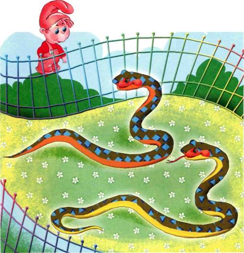 Стр. 5 СЛОН1. Идёт Язычок дальше. Ой, кто это такой большой, с длинным носом? Да это же... слон! Давай покажем, какой у слона хобот! Описание упражнения: сомкнутые губы вытянуть вперёд и удерживать в таком положении до счёта «пять» (потом до счёта «десять»), вернуться в исходное положение. 2. Смотрит Язычок на слона, а тот стал набирать хоботом воду и поливать себя и слонёнка. Описание упражнения: вытянуть вперёд губы трубочкой и «набирать» водичку, слегка причмокивая при этом. Я водичку набираю И ребяток поливаю! Буду подражать слону! Губы «хоботом» тяну. А теперь их отпускаю И на место возвращаю. Дополнительное задание: посмотри на вёдра и скажи, чем они различаются. ЗМЕЯПолюбовался Язычок слоном и пошёл к другой клетке. А там никого нет, только длинный резиновый шланг валяется посередине. Но вдруг шланг зашевелился, и Язы-чокувидел, что это... змея. Давай изобразим змею! Описание упражнения: улыбнуться, открыть рот; высунуть язычок изо рта, затем спрятать. Повторить 3-4 раза. Подражаем мы змее, С ней мы будем наравне: Высунем язык и спрячем, Только так, а не иначе. Дополнительное задание: посмотри внимательно на змей и найди 5 различий. |