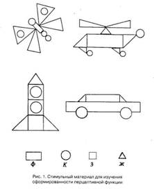 Стр. 4 1. Птичка свила гнездо. 2. В саду было много красных яблок. 3. Дети катали из снега комки и делали снежную бабу. По результатам выполнения этого задания учащимися первых классов специальной (коррекционной) школы VIII вида мы выявили у них следующие уровни сформированное речевой функции: I уровень (успешный) - правильное и точное воспроизведение предложений; II уровень (достаточный) - пропуск отдельных слов без искажения смысла и структуры предложений. III уровень (недостаточный)- пропуск частей предложений, искажение их смысла и структуры. Для оценки уровня сформированное перцептивной функции у учащихся первых классов специальной (коррекционной) школы VIII вида нами предложена следующая методика. Ребенку дается карточка с 4 рисунками (ракеты, бабочки, вертолета, автомобиля), составленными из геометрических фигур (см, рис. 1), и цветные карандаши. Требуется одинаковые геометрические фигуры закрасить определенным цветом (по предлагаемому образцу: прямоугольники - фиолетовым, круги - красным, квадраты - зеленым, треугольники - желтым цветом). Время работы - 5-10 минут. После анализа полученных результатов мы выделили следующие уровни сформированности перцептивной функции: I уровень (успешный) - выделены все группы фигур и раскрашены нужным цветом; II уровень (достаточный) - выделены две группы фигур (круги и треугольники) и раскрашены нужным цветом; допущены ошибки при раскрашивании квадратов и прямоугольников; (II уровень (недостаточный) - не выделено ни одной группы фигур, раскрашивание носит хаотичный характер. При оценке уровня сформированности мнемической функции у учащихся первых классов специальной {коррекционной) школы VIII вида нами применялась общеизвестная методика определения речеслуховой памяти «Десять слов». Для запоминания использовался следующий набор слов: год -слон - мяч - мыло - соль -шум -рука - пол - весна - сын. Слова зачитывались каждому ученику по четыре раза с фиксацией количества воспроизведенных им слов на каждом этапе запоминания. С целью проверки отсроченного воспроизведения спустя 40 минут после четвертого воспроизведения ученика вновь просили назвать запоминаемые слова (без предварительного их прочтения). Ответы также фиксировались в протоколе. |