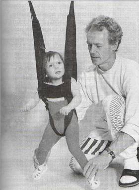 Стр. 17 Упражнение 24И. п. — стоя в тренажере на полу, руки в свободном положении. Эластичные тяги натянуты максимально. Самостоятельно или принудительно (методист стоит сзади, его руки упираются в переднебоковые поверхности бедер и помогают ребенку) согнуть ноги в коленях, оттолкнуться вверх, приземлиться на слегка согнутые ноги. Прыжковые движения повторяются. Для помощи в освоении отталкивания методист может ритмично надавливать и поднимать трапецию тренажера, стимулируя сгибание и разгибание ног и имитируя выпрыгивание (рис. 4.17). Рис. 4.17. Упражнение 24 Как вариант этого упражнения можно использовать различную степень натяжения эластичных тяг. При слабом натяжении приседание перед прыжком будет глубже и степень участия ребенка в отталкивании больше. При сильном — наоборот. Упражнение 25При достаточном освоении ребенком отталкивания можно разучивать прыжки с поворотом на 90, I 180 и 360° с упором в кольца и без них, а также прыжки с одновременным разведением ног в стороны, вперед-назад, поочередно на гной и другой ноге (рис. 4.18). Рис. 4.18. Упражнение 25 |