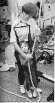 Стр. 23 Упражнение 39И. п. — стоя в тренажере на полу. Лазание по канату. Захватить одной рукой закрепленный на стене конец каната так, чтобы большой палец обхватывал канат спереди. Самостоятельно или принудительно, следя за правильностью постановки руки, захватить канат другой рукой на некотором расстоянии выше первой. Методист следит за правильностью захвата (рис. 4.23). Рис. 4.24, Упражнение 39 Последовательно переставляя руки вверх, переместиться на такое расстояние, чтобы тело зависло в воздухе. Раскачивать ребенка, держащего канат одной или двумя руками, движениями вперед-назад и из стороны в сторону. Упражнение развивает силу рук, исправляет порочное положение кисти, тренирует вестибулярный аппарат, развивает смелость (рис. 4.24). Рис. 4.24, Упражнение 39 Упражнение 40И.п. - стоя. Эластичные тяги обеспечивают исходное положение. Обхватить самостоятельно или принудительно (методист стоит сзади ребенка и управляет его кистями) мяч среднего размера. Пальцы раскрыты и сжимают мяч. Поворачивать мяч на себя и от себя относительно предплечий, не выпуская его из рук. Бросить мяч другому методисту или в какую-либо цель (баскетбольную корзину, стену, коробку и т. д.). Как вариант этого упражнения, из того же и. п. игра в отскакивающий от пола мяч. Один методист в медленном темпе набивает мяч большого размера об пол, другой — сзади, захватив запястье ребенка, совершает удары по мячу открытой ладонью в такт игры. Используются различные варианты: одной рукой, потом другой, затем обеими. Упражнение особенно эффективно при большом количестве повторений (не менее 40-50 каждой рукой), для исправления порочного положения кисти, расслабления руки, развития координации, формирования опорности на руки (рис. 4.25). Рис. 4.25. Упражнение 40 |