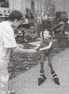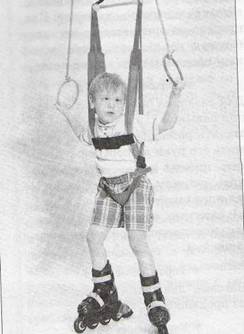 Стр. 35 Роликовые коньки.Основное назначение использования роликовых коньков в тренировочном занятии: - улучшение подвижности голеностопного сустава, - стимуляция функции мышц передней поверхности голени, - развитие чувства равновесия, - улучшение координации движений, - эмоциональное восприятие передвижения. Используются различные варианты коньков: для маленьких детей — легкие 4-опорные (двухрядные) пластмассовые с регулируемой длиной платформы. Для старших детей — современные, однорядные роликовые коньки с ботинками. Упражнение 65Для проведения занятия ребенка закрепляют в тренажере так, чтобы эластичные тяги позволяли свободно стоять на роликовых коньках и страховать от падения. Маленькие пластмассовые роликовые коньки надевают на ботинки и жестко закрепляют. Большие - прямо с ботинками надевают на ноги (рис. 4.37). Рис. 4.37. Упражнение 65 Для привыкания к конькам методист предлагает ребенку сделать несколько, шаговых движений вперед и назад, затем прокатывает, держа его за руки, кольца тренажера или вложенный в руку предмет (небольшая гимнастическая палка, обруч и т.д.) (рис. 4.38). Рис. 4.38. Упражнение 65 Удобно использовать различные каталки, которые ребенок может продвигать вперед. При принудительном катании методист стоит сзади, слегка сгибает в колене одну, затем другую ногу катающегося, имитируя шаговое движение. При прокате он опирается на переднебоковую поверхность бедра ребенка и продвигает его вперед-назад. |