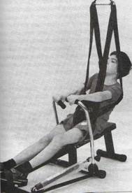 Стр. 38 Гребной эргометрИспользуется для формирования навыка отталкивания двумя ногами, сгибания и разгибания ног в тазобедренном, коленном и голеностопном суставах, развития силы и координации движений рук и ног. Упражнение 74И. п. — гребной эргометр устанавливают под натянутым тросом. Ребенка закрепляют в тренажере гак, чтобы он мог сидеть на эргометре. Ноги фиксируют на педалях, руки в свободном положении (рис. 4.39). Рис. 4.39. Упражнение 74 Вначале разучивают только отталкивание двумя ногами и удержание тела на сиденье при продвижении вверх-вниз. Фиксируют время работы и количество движений. При принудительном выполнении методист садится на гребной эргометр сзади ребенка и, придерживая его за ноги, помогает выполнять упражнение. Упражнение 75После освоения движения одними ногами переходят к разучиванию одновременных движений руками и ногами. Методист садится сзади ребенка, вкладывает в его руки «весла», придерживает их своими руками и совершает вместе с ребенком движения, имитирующие греблю. |