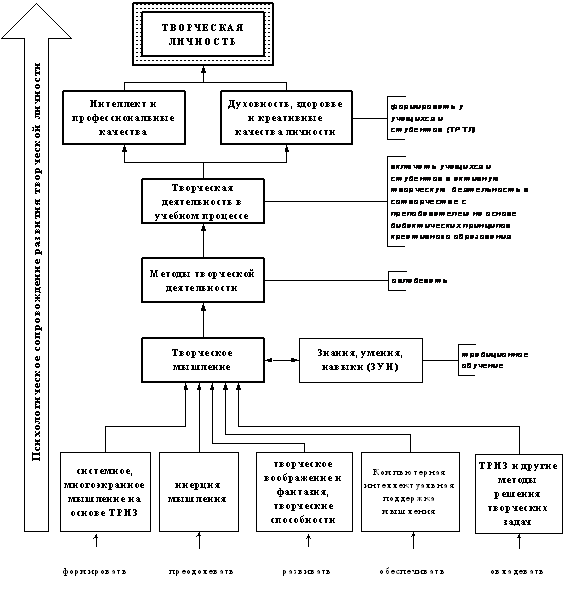 Стр. 14 Опираясь на результаты обобщения новых концепций обучения и инновационных технологий, а также на результаты собственных фундаментальных исследований и исследований ученых-педагогов и психологов, разработчиков теории решения изобретательских задач, в МНОЦИТ МГИУ была синтезирована концепция, разработаны и реализованы в учебном процессе на всех образовательных уровнях педагогические основы многоуровневой системы непрерывного креативного образования НФТМ. Эта целостная педагогическая система НФТМ имеет целями непрерывное формирование системного, многоэкранного творческого мышления и развития творческих способностей учащихся и студентов и в итоге – развитие творческой личности. На рис. 4 показана модель формирования творческой личности учащихся и студентов в системе многоуровневого непрерывного креативного образования.