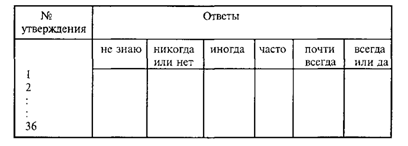 Стр. 120 20. Фильмы и книги могут вызвать слезы только у несерьезных людей. 21. Мне нравится наблюдать за выражением лиц и поведением незнакомых людей. 22. В детстве я приводил домой бездомных собак и кошек. 23. Все люди необоснованно озлоблены. 24. Глядя на постороннего человека, мне хочется угадать, как сложится его жизнь. 25. При виде покалеченного животного я стараюсь ему чем-то помочь. 26. В детстве младшие по возрасту ходили за мной по пятам. 27. Человеку станет легче, если внимательно выслушать его жалобы. 28. Увидев уличное происшествие, я стараюсь не попадать в число свидетелей. 29. Младшим нравится, когда я предлагаю им свою идею, дело или развлечение. 30. Люди преувеличивают способность животных чувствовать настроение своего хозяина. 31. Из затруднительных конфликтных ситуаций человек должен выходить самостоятельно. 32. Если ребенок плачет, на то есть свои причины. 33. Молодежь всегда должна удовлетворять любые просьбы и чувства стариков. 34. Мне хочется разобраться, почему некоторые из моих знакомых иногда задумчивы. 35. Беспризорных домашних животных следует уничтожать. 36. Если мои друзья начинают обсуждать со мной свои личные проблемы, я перевожу разговор на другую тему. Обработку результатов следует начинать с определения достоверности данных. Для этого необходимо подсчитать, сколько ответов дано на следующие номера утверждений опросника: Лист ответов опросника экспресс - диагностики эмпатии 1. В графе «не знаю» в утверждениях номер 2, 4, 16, 18, 33. 2. В графе «всегда или да» в утверждениях номер 2, 7, 11, 13, 16, 18, 23. |