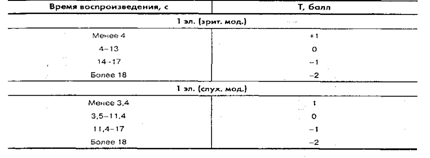 Стр. 87 ОП-26. Слова на зрение: разряд, смех, совесть, мастер, шум, шлея, труд правда, краска, музыка, метод, тишина. Процедура предъявления. После предъявления слов испытуемый записывает их, а экспериментатор фиксирует время воспроизведения. Обработка результатов: 1. Подсчитывается показатель успешности А = В + Т, где где с — количество правильно воспроизведенных элементов; т — количество ошибочно воспроизведенных элементов (слов); п — количество про пущенных элементов. Внести поправку на время, переведя t воспроизведения. 1 элемента в балл Т. Показатель А объема памяти на слова переводится в сопоставимые шкальные оценки (табл. 8). Таблица 8. Перевод времени воспроизведения 1 слова в баллы Домашнее задание Решите задачи и запишите ответы в тетрадь для практических работ: Задача 1. Выберите правильный ответ из предложенных вариантов. 1. Сенсорная память... а) действует на уровне рецепторов; б) сохраняет информацию в интервале меньше 1 с; в) лежит в основе зрительных образов; г) является генетически первичным видом памяти; д) все ответы верны; е) все ответы неверны. 2. Кратковременная память... а) сохраняет информацию в пределах двух минут; б) обладает емкостью, не превышающей 11 элементов; в) позволяет долго помнить телефонный номер; г) короче оперативной; д) все ответы верны; е) все ответы неверны. 3. Долговременная память... а) обладает ограниченной емкостью; б) обладает практически неограниченной длительностью; в) более развита у пожилых людей; г) обобщение образов и представлений; д) не связана с эмоциями; е) все ответы верны; ж) все ответы неверны. 4. Принцип специфичности кодирования касается... а) контекста, в котором осуществляется кодирование; б) мотивации субъекта; в) времени повторений одного и того же материала; г) времени, необходимого для того, чтобы интегрировать материал; д) все ответы верны; е) все ответы неверны. |