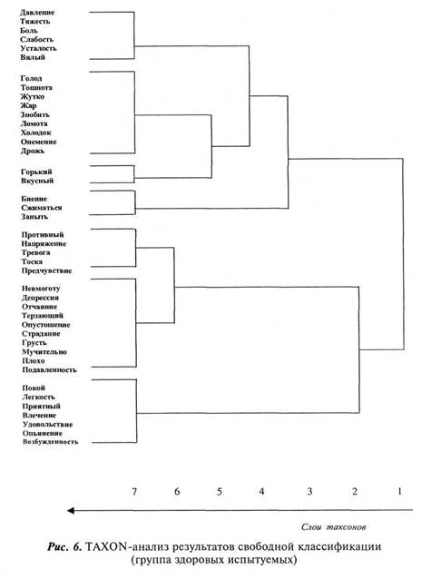 Стр. 167 Отступление от культурных стереотипов и усложнение индивидуального опыта имеют сходные внешние проявления: уменьшение внутригрупповой согласованности и выравнивание объемов «общего» и «знакомого» словарей. Эта тенденция усиливается с увеличением опыта болезни (СНОСКА: Поскольку реальную длительность заболевания не всегда возможно установить повторной (повторных) госпитализации, а для онкологических больных — срок, прошедший с момента операции (более или менее трех лет). Понимая известную условность такого деления, можно, тем не менее, предполагать, что в отличие от других, не менее спорных, оно хотя бы легко верифицируемо) и проявляется, в частности, в динамике такого показателя стереотипности, как количество слов, ни разу не использованных испытуемыми в своих сортировках. 7.6. Структурный анализ интрацептивных словарейХотя объем и содержание интрацептивных словарей достаточно информативны и сами по себе, они не позволяют судить о эазовых принципах категоризации, используемых испытуемыми. Одно и то же определение может иметь различные семантические эттенки и использоваться в различных смыслах. Кроме того, маловероятно, что человек пользуется неограниченным количеством способов упорядочивания своего опыта. Скорее всего, число таких координат конечно. Это предположение подтверждается эгромным числом работ по психосемантике экстрацепции, и нет никаких оснований не предполагать возможности выделения конечного количества координат в интрацептивной семантике (Osgood et al., 1957; Леонтьев А.А., 1969; Артемьева, 1980; Петренко, 1983; Шмелев, 1983). Для решения задачи выделения таких инвариант проводился специальный эксперимент по «свободной» классификации ощущений, позволяющий уловить наиболее интересный момент — принятие испытуемым индивидуальной стратегии встречного структурирования воспринимаемой стимуляции. После отбора «знакомых» интрацептивных ощущений испытуемому предлагалось в условиях «глухой» инструкции объединить выбранные слова-признаки по сходству: «что к чему подходит», «объединить похожие ощущения» (III инструкция). После нормирования матрицы сходства строилось гаксонное дерево. |