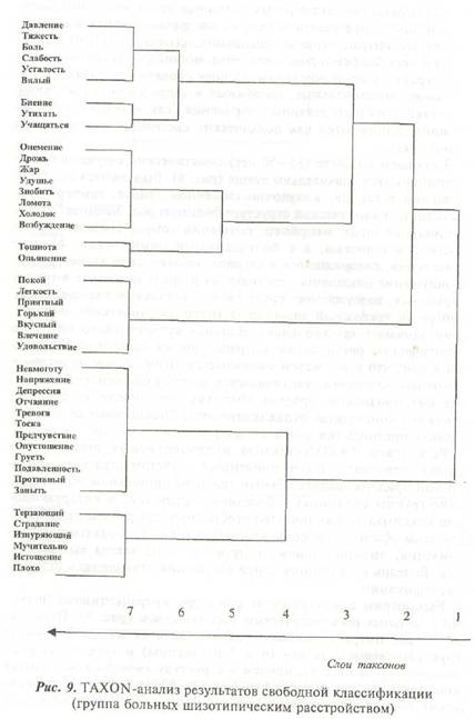 Стр. 170 Результаты TAXON-анализа интрацептивных ощущений у больных становятся более понятными с учетом стратегии, которой они придерживались. Самым главным принципом было выделение группы связанных с болезнью ощущений, в которую входило максимальное количество отобранных для работы признаков. При этом обычные способы классификации: по модальности, локализации, эмоциональному тону и пр. — не всегда выдерживались. Болезнь и связанные с ней ощущения становились центром классификации. Рассмотрим семантическую структуру интрацептивных значений у больных шизотипическим расстройством (рис. 9). Первоначально все интрацептивные признаки делятся на две основные структуры: «моя болезнь» (6 и 7-й таксоны) и «все остальное» (таксоны с 1-го по 5-й), причем в структуру «моя болезнь» входят лишь признаки неприятных душевных состояний, тогда как физические ощущения остаются вне ее. Далее, во втором слое, все признаки, не относящиеся к категории «моя болезнь», разделяются на приятные (7-й таксон) и локализованные болезненные физические ощущения, похожие на аналогичные группы у здоровых испытуемых («тонус», «сердце», «общее недомогание», «опьянение-отравление»). Приятные же ощущения немногочисленны и недиф-ференцированы (в один блок входят «вкус», «тонус» и эротические переживания). Наиболее интересным феноменом является то, что у больных шизотипичеким расстройством при обилии жалоб на соматические недомогания реальные словари телесных ощущений сформированы даже хуже, чем у здоровых испытуемых. Словарь ощущений в области сердца, например, первым отделяющийся от других физических ощущений, у больных данной группы довольно долго слит с ощущениями в голове и ощущениями тонуса. Это хорошо объясняет неясность, расплывчатость, плохую локализованность соматических ощущений при ипохондрических синдромах у больных шизофренией (Ротштейн, 1961; Смулевич, 1987). Зато у больных шизотипическим расстройством при первом же разбиении таксонного дерева образуется обширный класс объективированных неприятных психических состояний, составляющий содержание их телесного опыта, и очень рано выделяется (на уровне 4-го слоя) кластер особо мучительных ощущений. Эти феномены позволяют понять особый характер сенестопатических интрацептивных ощущений у больных шизофренией, отмеченный еще Э.Дюпре (Dupre, 1925): трудности вербального описания телесного опыта и особый оттенок соматических ощущений — не просто болезненность, а мучительный характер. Трудности описания связаны с тем, что сам «соматический» словарь плохо разработан, а то, что, собственно, больной переживает и должен описать, составляет особый класс телесных ощущений: не конкретно-локализованных, органных, а объективированных психических переживаний, которым трудно подобрать адекватный «соматический» язык. Представленность же в жалобах «мучительности» переживаемых ощущений отражает существование развитого и хорошо усвоенного конструкта. |