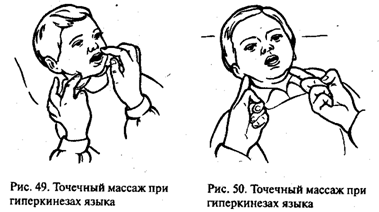 Стр. 94 В клинике детского церебрального паралича отмечается довольно раннее появление гиперкинезов в мимической мускулатуре и особенно в языке. Подавление гиперкинезов производится, когда ребенок находится в одной из поз «Рефлексо-запрещающих позиций». Перед массажем проводят упражнения, предложенные К.А. Семеновой: потряхивая руку и ногу ребенка, сближают их в области колена и локтя (правый локоть с левым коленом и наоборот). Несколько движений (2-3 раза) попеременно справа и слева способствуют ослаблению гиперкинезов. В основе логопедического массажа, направленного на уменьшение гиперкинезов, лежит перекрестный точечный массаж, разработанный К.А. Семеновой. § Точечный массаж при гиперкинезах языка: 1) перекрестный точечный массаж в области губ: указательный палец левой руки помешается в середине носогубной складки слева, а указательный палец правой руки под углом губ справа (рис. 47). Производят одновременно вращательные движения указательными пальцами в указанных точках. Затем указательные пальцы перемещаются. Указательный палец правой руки помешается на носогубную складку справа, а указательный палец левой руки опускается под угол губ слева, и производят вновь те де движения; 2) следующий прием точечного массажа при гиперкинезах. Указательный палец левой руки располагается в области середины носогубной складки слева, а указательный палец правой руки помещается под угол нижней челюсти справа. Производятся вращательные движения в этих точках. Затем движения проводятся на противоположной стороне (рис. 48, 49); 3) указательный палец левой руки располагается в той же точке, что и при упражнении (1, 2), или же в точке под углом слева, а указательный палец правой руки фиксируется под сосцевидным отростком за ухом. Установив пальцы в данных точках, проводят глубокий точечный массаж, затем это же упражнение проводят на противоположной стороне (рис. 50); 4) при резко выраженных гиперкинезах используются следующие точки. Если палец левой руки фиксируется в зоне носогубной складки или под углом губ слева, то палец правой руки занимает точку под внутренним углом лопатки справа, осуществляются вращательные движения в данных точках. Затем это упражнение повторяется с противоположной стороны; |