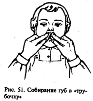Стр. 95 5) при стойких гиперкинезах используют точки, находящиеся под коленкой, и точку в области одной из носогубных складок и тоже делают точечный перекрестный массаж. Эти упражнения не должны вызывать у ребенка чувства болезненности, неудобства, дискомфорта. Особенностью использования этих приемов является то, что каждое движение повторяется 3-4 раза, подбираются они строго индивидуально и осторожно, так как неправильное выполнение может еще больше усилить гиперкинез. Точечный массаж производится ежедневно. Упражнения подбираются в зависимости от состояния мышечного тонуса артикуляционной зоны. По длительности массаж не превышает пяти минут. С детьми, находящимися на III и IV уровнях доречевого развития, логопедический массаж, кроме нормализации тонуса мышц языка, губ и ослабления гиперкинезов, направлен на развитие афферентации оральной мускулатуры (речевых кинестезии). При асимметрии, неравномерном распределении тонуса в артикуляционных мышцах массаж проводится с гиперкоррекцией соответствующей стороны - на пораженной стороне большее число движений (10-12). Кроме приемов ручного массажа, используется специальный аппарат - вибромассажер, насадки применяются соответственно инструкции. Таким образом, массаж проводится с целью ослабления патологических проявлений в мышцах артикуляционного аппарата, расширения возможностей движения речевых мышц и включения их в процесс произношения. Кроме того, для активизации мышц речевого аппарата применяют артикуляционную гимнастику. Артикуляционная гимнастика Артикуляционная гимнастика с детьми раннего возраста, страдающими церебральным параличом, проводится как в пассивной, так и в активной форме. Пассивная гимнастика. Пассивные движения органов артикуляции, которые выполняет логопед, способствуют включению в процесс артикулирования мышц, до этого бездействующих. Это создает условия для формирования произвольных движений речевой мускулатуры. С детьми, находящимися на I уровне доречевого развития, проводится пассивная гимнастика для губ. |