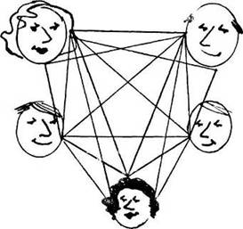 Стр. 115 Теперь эта карта выглядит так. Не правда ли, уже трудно выделить отдельные ее части? Мы видим, как буквально на глазах связи между треугольниками переплетаются и усложняются. В семьях мы живем не парами, а треугольниками. Когда родился Джо, то образовались сразу три треугольника, а не один. Треугольник — это пара плюс еще один человек, а поскольку одновременно общаться могут лишь два человека, то третий часто остается как бы лишним. Суть треугольника меняется в зависимости от того, кто в данный момент оказывается в стороне. Три изображенных вверху треугольника состоят из Элис, Джона и Джо. В первом из них отец Джон находится как бы в стороне — он наблюдает за отношениями своей жены Элис и сына Джо. Во втором Элис наблюдает за мужем и сыном. В третьем маленький Джо смотрит на маму и папу. И от того, кто находится в данный момент в позиции постороннего наблюдателя, и насколько дискомфортно он чувствует себя в этой роли, зависит уровень напряженности отношений внутри того или иного треугольника. Справедлива старая поговорка: «Двое — компания, трое — толпа». У «лишнего» члена треугольника всегда есть выбор: или вмешаться и нарушить взаимоотношения двух других человек, или поддерживать их общение, оставаясь заинтересованным наблюдателем. Этот выбор будет решающим для характера связей внутри семьи. Между людьми в треугольниках могут складываться всевозможные отношения и возникать ситуации. Когда двое разговаривают, третий может перебивать их, пытаясь привлечь внимание к себе. Если между двумя членами треугольника возникают разногласия, один из них может призвать в союзники третьего. Таким образом треугольник изменяется — постоянно кто-то другой оказывается в стороне. Можете ли вы припомнить, когда в последнее время вы находились в позиции наблюдателя по отношению к двум другим членам вашей семьи? Как вы вели себя? Что чувствовали? Какие треугольники есть в вашей семье? Вообще, в семьях очень много треугольников. В семье Линтонов, состоящей из пяти человек, их тридцать: |