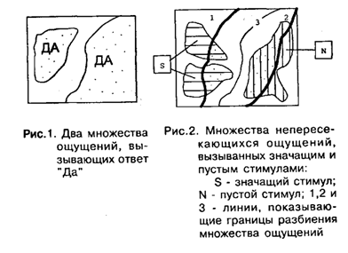 Стр. 59 Линии 1, 2 и 3 показывают границы разбиения, соответствующего трем схемам соответствия, причем область "Да" при всех схемах соответствия лежит слева от этих границ. Рассмотрим сначала схему соответствия 1. Мы видим, что при такой схеме <N> всегда будет идентифицироваться правильно, т.е. p(FA) = 0. Однако, <S> иногда (когда ощущение, вызванное <S>, попадает правее границы — эта область помечена точками) вызовет ответ "Нет", т.е. испытуемый будет иногда пропускать сигнал, р(Н) < 1. При схеме соответствия 2 ситуация обратна. Испытуемый всегда идентифицирует <S> как "Да", т.е. р(Н) = 1, но иногда (эта область помечена точками) <N> будет вызывать ответ "Да" (ложная тревога), т.е. p(FA) > 0. Легко видеть, однако, что при данном сорасположении ощущений, вызываемых <S> и <N>, испытуемый может в принципе выработать такую схему соответствия (граница 3, штриховая линия), при которой можно избежать ошибок, т.е. p(FA) = 0 и р(Н) = 1. Причина, обеспечивающая эту возможность, заключается в том, что указанные области не пересекаются, т.е. нет ни одного ощущения, которое могло бы быть вызвано (пусть с разной вероятностью) как <S>, так и <N>. Если это условие не выполняется (см. рис. 3), то, очевидно, при любой схеме соответствия испытуемый будет совершать ошибки того или иного рода (О или FA), либо и те, и другие. Такова суть модели. Чтобы представить модель в количественной форме, допускаются два дополнительных упрощения. Первое из них может быть разъяснено следующим образом. Схема соответствия с содержательной точки зрения представляет собой соответствие данного ответа некоторому комплексу свойств сенсорного образа: "Если образ обладает свойствами таким-то и таким-то, то следует выбрать ответ "Да", в противном случае — "Нет". Очевидно, что не все свойства образа при этом используются. Рассматриваемое упрощение состоит в предположении, что решение принимается всегда на основе интенсивности какого-то одного качества сенсорных образов ("сладкость", "наклонность", "яркость" и т.п.), причем правило принятия решения имеет форму: "Если интенсивность (выраженность) качества больше некоторой величины С, то следует выбрать "Да", в противном случае — "Нет". Интенсивность качества, как это видно из предыдущей фразы, предполагается представимой действительным числом. Таким образом все возможные значения интенсивности данного качества занимают какую-то часть оси действительных чисел (например, всю положительную полуось), причем каждое из этих значений при предъявлении данного стимула может быть вызвано с тем или иным правдоподобием. Если значения интенсивности сенсорных образов образуют непрерывный континуум, то это правдоподобие выражается не вероятностью, а плотностью вероятности. Плотность вероятности возникновения ощущения со значением интенсивности ощущения Х при подаче стимула А условимся обозначать через f (X/A). |