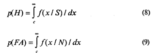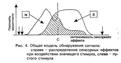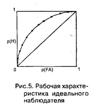 Стр. 60 Вернемся теперь к нашей ситуации, где стимул есть либо <S>, либо <N>. Каждому из стимулов соответствует своя функция плотности вероятности: f (X/S) и f (X/N) (рис. 4). Согласно принятому утверждению, правило принятия решения определяется выбором граничной точки С (ее еще называют критической точкой или величиной критерия принятия решения о наличии сигнала), такой, что если интенсивность Х в данной пробе превышает С, то следует ответ "Да", если же не превышает, то — "Нет". Легко видеть по рисунку, что вероятность ложной тревоги p(FA) равна вероятности того, что интенсивность Х (при условии, что предъявлен <N>) превзойдет С, т.е. равна заштрихованной области под кривой f (X/N). Вероятность попадания р(Н) равна вероятности того, что Х (при условии, что предъявлен <S>) превзойдет С, т.е. равна незаштрихованной области под кривой f (X/S). Если критерий С находится далеко вправо (показано на рис. 4 одной стрелкой), то, очевидно, p(FA) = p(H) = 0. Если теперь начать двигать критерий справа налево, то при каждом очередном значении мы будем получать новую пару p(FA) и р(Н), причем оба значения будут возрастать (или по крайней мере не убывать), пока при достаточно далеком левом положении С оба не станут равны 1 (показано двумя стрелками на рис. 4). Поскольку каждое значение С однозначно определяет пару чисел p(FA) и р(Н), то ему можно поставить в соответствие точку внутри квадрата (рис. 5), на вертикальной стороне которого откладывается р(Н), а на горизонтальной — p(FA), и таким образом представить результат работы наблюдателя. Полученная по этим точкам кривая называется рабочей характеристикой наблюдателя или просто — РХ. Любая пара распределений, f (X/S) и f (X/N) однозначно определяет РХ, но обратное неверно: одна и та же РХ может определяться различными парами f (X/S) и f (X/N). РХ идет из точки (0,0) квадрата в точку (1,1) и при этом располагается выше его главной диагонали. Последнее следует из того, что распределение f (X/S) сдвинуто вправо этносительно f (X/N), т.е. р(Н) превышает p(FA). (СНОСКА: Очевидно, что когда наблюдатель фактически не обнаруживает сигнал и p(H) = p(FA), точки РХ будут лежать на диагонали.) |
