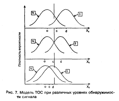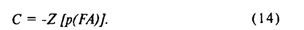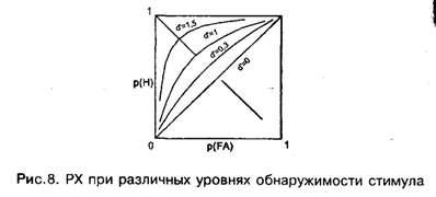 Стр. 63 Если допустить, что σs,n = 1, т.е. дисперсии обоих распределений равны, а центр распределения f (Z/S) сдвинут вправо от центра распределения f(Z/N) на величину а, тогда В этом случае вместо а обыкновенно пишут специальный символ d' и называют эту величину мерой чувствительности наблюдателя к сигналу. Чувствительность к сигналу характеризуется степенью отличия Z-величин, вызываемых <S>, от Z-величин, вызываемых <N>. Чем меньше величина d', тем больше перекрываются области Z-значений, соответствующих <S> и <N> (рис. 7). Легко видеть, что при одном и том же положении критерия С, а следовательно, при одной и той же величине p(FA), величина р(Н) тем ближе к p(FA), чем меньше d'. Если d' = 0, то p(FA) = р(Н) при всех С и, следовательно, РХ в таком эксперименте совпадает с главной диагональю квадрата (рис. 8). Если d' > 0, РХ лежит выше диагонали и имеет гладкий и симметричный вид относительно побочной диагонали, идущей из (0,1) в (1,0). Чем больше d', тем более выпукла РХ влево-вверх и тем дальше она отстоит от главной диагонали. Как же практически вычислить d' и С по результатам эксперимента? Сколько точек РХ следует для этого иметь? Оказывается, достаточно только одной точки, т.е. только одной пары p(FA), p(H). Действительно, Это уравнение необходимо решить относительно С. Введем новый термин: нахождение С по Р в уравнении (12): Сделать Z-преобразование можно по обычной таблице нормального распределения. Если есть таблица, показывающая для каждого С значение интеграла (12), то нужно попросту отыскать в таблице значение интеграла, наиболее близкое к Р, и посмотреть слева, какому С оно соответствует. Легко показать, что уравнение (11) в терминах Z-преобразования имеет решение: Теперь допустим, что С найдено. Как, зная р(Н), найти величину d'? Рассмотрим теоретическую картинку, из которой удалено распределение, соответствующее N (оно уже не понадобится, см. рис. 9а). Сдвинем все распределение вдоль оси Z вместе с критерием С влево так, чтобы центр совместился с точкой 0. Критерий С при этом, очевидно, займет позицию (С - d'), а заштрихованная область не изменится и останется равной по площади р(Н) (см. рис. 9б). Но наше сдвинутое распределение имеет центр в нуле и единичную дисперсию. |