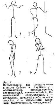 Стр. 20 Сабин и Хардик предприняли исследование с целью выявить влияние поз на ролевое восприятие (СНОСКА: Lindzey G. (ed.). Handbook of social psychology. London, 1959. 14 См.: Бернштейн Н. А. Новые линии развития в физиологии и их соотношение с кибернетикой.— В кн.: Философские вопросы физиологии высшей нервной деятельности и психологии. М, 1963). Полученные данные они интерпретировали с позиций распространенной сейчас на Западе теории ролей. В ходе эксперимента они предъявляли испытуемым одну за другой сорок две так называемые «палочные» фигуры человека, которым придавались различные позы. Каждый участвующий в опыте должен был сказать, какое состояние, по его мнению, испытывает человек, для которого характерна та или другая смоделированная с помощью «палочной» фигуры поза. Авторы пришли к выводу, что определенные позы связываются с определенными действиями или качествами личности. Примеры некоторых из полученных ими от испытуемых ответов — толкований поз мы приводим (рис. 1). Походка человека также обогащает наше впечатление о нем. Отраженная нами, она может быть сигналом состояния человека, иногда говорить о перенесенных им болезнях, о роде его занятий (походка альпиниста, моряка, солдатский шаг и пр.). Ходить, как известно, учатся, не руководствуясь каким-то общим образцом. Тем не менее все индивидуальные варианты походок можно свести к определенным средним формам и в них выделить объединяющие их признаки. Походка каждого человека характеризуется рядом черт: ритмом, скоростью, давлением на поверхность, длиной шага, эластичностью, определенностью направления и изменчивостью. Походке может быть присуща большая или меньшая естественность. Неестественность в походке появляется у человека при состоянии «скованности», чрезмерного напряжения. Эта неестественность может быть связана и с телесными аномалиями. Изучением механизма ходьбы и исследованием походки занимались Н. А. Бернштейн и, Вебер, Браун, Фишер, Бой-тендайк, Энке, Покорны и др. Установлено, что темп ходьбы может быть замедленным или убыстренным, и в нем, как и вообще в моторике человека, находят выражение общее состояние организма и, по утверждению ряда исследователей, такие особенности, как экстраили интравертированность личности. В работах, посвященных анализу походки, мы находим и другие попытки связывать ее особенности с состоянием человека и чертами его характера. Так, Р. Покорны в работе «О выражении человека в походке» (СНОСКА: Pokorny R. Ober den Ausdruck des menschlichen Ganges.— Der Bericht uber den sechszehnten internationalen Kongress. Amsterdam, 1961) указывает, что раскачивание при ходьбе — признак аккуратности, точности, иногда даже педантичности. В некоторых случаях раскачивающаяся походка, по уверению указанного психолога, свидетельствует о тщеславии. Он же полагает, что нарушение нормальных пропорций между ростом человека и длиной его шага тоже может свидетельствовать об определенном состоянии или даже чертах характера. Например, необычно большие шаги малорослого могут означать желание быстрее достичь цели, стремительность, энергию. Маленькие шаги высокого человека могут говорить не только о неторопливости, но и о робости, о желании отдалить встречу с кем-то и т. п. |