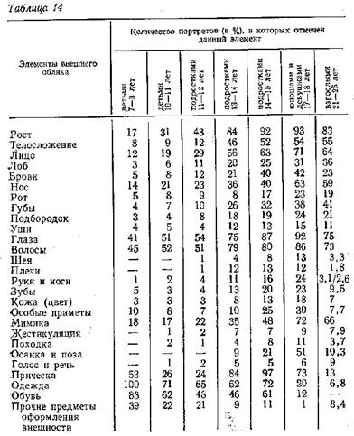Стр. 89 3. С возрастом неуклонно падает включение в «портрет» воспринимаемого человека (при решении той задачи, которая была поставлена перед всеми группами испытуемых) описаний элементов, образующих оформление внешности человека. Процент фиксирований этой стороны внешности в описаниях облика воспринимаемого человека по сравнению с процентом фиксирований ее детьми 7— 8 лет падает к 21—26 годам в 14,9 раза. Если графически изобразить проявление этих тенденций при отображении различных сторон внешнего облика, то получается такая картина (рис. 2). Теперь сравним между собой данные по каждому возрасту, которые показывают, как часто тот или иной элемент, входящий во внешний облик, был включен в описание воспринимаемого человека каждой из групп испытуемых (табл. 14). Из данных таблицы 14 следует, что достигшие совершеннолетия школьники фиксируют рост воспринимаемых сверстников при описании внешнего облика их в 5,5 раза чаще, чем это делают первоклассники, отмечают телосложение в 6,7 раза чаще, чем дети 7 — 8 лет. Школьники, кончающие школу, описывая внешность сверстника, отмечают форму лица как существенный признак в 5,9 раза чаще, чем это делают ученики 1-го класса. Такое же увеличение процента фиксирований имеет место и при отображении других элементов физического облика. При этом, как видно из таблицы 14, темп и «потолок» роста процента фиксирований неодинаковы для разных компонентов. Хотя процент фиксирований различных компонентов в физическом облике нарастает и в описаниях, выполненных учащимися старших классов школы, однако особенно резко этот рост фиксирований многих из элементов физического облика происходит между 5-м и 8-м классами. В то время как в 11-м классе «потолок» роста процента фиксирований таких компонентов, как общая длина тела, достигает 93% описаний, глаза —92, волосы — 86, форма лица —71%, для других компонентов физического облика этот «потолок» значительно ниже (лоб —31% описаний, подбородок — 24, уши — 15% и т.д.). Как увеличение процента фиксирований каждого элемента физического облика, так и появление указанного «потолка» говорят о том, что в школьные годы продолжается начавшийся еще в пред-дошкольном и дошкольном возрасте процесс дифференциации отдельных элементов физического облика и происходит переоценка в осознании степени важности каждого из них для характеристики индивидуальных особенностей внешности. То же происходит, и с отображением экспрессии. Процент «портретов», в которых описана мимика воспринимаемого сверстника, возрастает к 17—18 годам по сравнению с 1-м классом в 4 раза. Как существенные признаки внешнего облика описываются в «портретах», созданных одиннадцатиклассниками, и жестикуляция, и походка, и поза, и голос, и речь. Таким образом, хотя практически человек сравнительно рано начинает читать «язык» экспрессии и пользоваться им в своем общении с окружающими, однако тот факт, что выразительное поведение — важный признак в числе характерных индивидуальных особенностей внешнего облика, осознается постепенно. Судя по полученным данным, особенно заметные изменения происходят в этом отношении с вступлением человека в старший школьный возраст. |