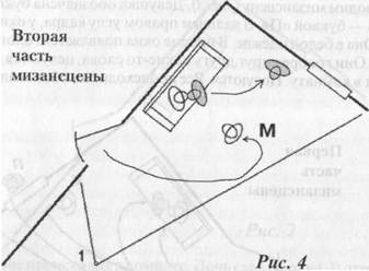 Стр. 39 Рисуем угол комнаты с окном и дверью. Устанавливаем диван на промежуточной глубине от объектива (рис. 2). Точку выбираем такую, чтобы иметь возможность видеть все пространство. Объектив — короткофокусный. Он поможет держать в резкости актеров почти в любой точке. Дверь располагаем ближе к камере с тем, чтобы входящий сразу оказывался на первом среднем плане и его появление было более эффектным и неожиданным, производило большее эмоциональное впечатление. Разводим мизансцену (рис. 3). Девушка обозначена буквой «Д», парень — буквой «П». В дальнем правом углу кадра, у окна, стоит дочь. Она в белой одежде. В проеме окна появляется голова и торс парня. Они говорят друг другу какие-то слова, целуются. Парень влезает в комнату. Целуются. Все происходит на общем плане. Дочь тащит парня в середину комнаты. Она хочет показать свое Расположение к нему. Первая позиция. Мы могли бы сразу усадить их на диван. Но мы этого не сделали. Почему? Да, потому, что мы в первой части кадра показали поступки ге-Роев, которые характеризуют ситуацию: парень тайно проникает в Комнату, а дочь содействует его поступку. Кроме них в комнате никого нет. Такова была основная информация начала кадра. Образы действия «сообщили» нам об этом. Но требуется показать, как герои относятся друг к другу, какие чувства их обуревают, какова мера искренности этих чувств. На общем плане такое не увидишь. Следовательно, требуется крупный или почти крупный план. Для этого мы перемещаем наших героев значительно ближе к объективу. Девушка уводит своего возлюбленного от окна в глубь комнаты, стараясь уберечь себя и его от посторонних взглядов. Вторая позиция. При такой крупности вся информация об их переживаниях, о «качестве» их эмоций проявляется на лицах. Можно даже усложнить мизансцену и после одного поцелуя развернуть парня спиной к аппарату, а девушку — лицом (на плане и в раскадровках это не показано), чтобы убедить зрителя в обоюдности их влечения друг к другу. |