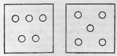 Стр. 245 Можно предложить детям и такое задание, когда требуется запомнить количество предметов, их цвет и пространственное расположение. Например, воспитательница предлагает положить слева от себя шесть зеленых треугольников, а справа от себя четыре красных треугольника. Затем дети рассказывают, каких сколько и где лежат. «А что еще можно о них сказать, если ты не знаешь, где сколько?» — «Слева у меня множество зеленых треугольников, а справа множество красных треугольников».— «А нельзя ли эти множества объединить в одно? Что тогда можно сказать про это множество?» Дети объединяют обе группы треугольников и говорят, что у них одно множество треугольников. Но это множество состоит из двух частей: одна часть — зеленые треугольники, а другая часть — красные треугольники. Воспитательница предлагает припомнить, сколько треугольников входит в состав красных и сколько в состав зеленых. Что должны сообразить дети, выполняя такое задание? То, что перед ними два множества, которые м о г yj быть объединены в одно, состоящее из двух частей, при этом каждая из них обладает своим цветом; а также помнить о связи количества с цветом треугольников и о месте расположения каждой из групп (справа или слева). По мере упражнений все связи числа с предметом, его цветом, пространственным расположением предметов становятся привычными для детей, и количество ошибок при выполнении заданий постепенно уменьшается. В значительной степени этому помогает громкое проговаривание (самоотчет). Выполнение задания должно сопровождаться опросом нескольких детей. Надо учитывать, что детям не сразу удается рассказать, что они сделали, поэтому можно помочь наводящими вопросами, например: «Какого цвета и сколько треугольников у тебя лежит справа?», «А слева какого цвета треугольники и сколько их?» и т. д. Рис. 14. Обучение счету при разном пространственном расположении предметов. В старшей группе вполне можно варьировать расположение предметов. Дети должны научиться считать предметы «по кругу», по вертикали, в виде числовой фигуры и расположенные неопределенной группой (рис. 14). Важно при этом обратить их внимание на то, что необходимо запомнить, с какого предмета они начали счет, чтобы не сосчитать дважды один и тот же предмет и в то же время не пропустить ни одного. Целесообразно поэтому постепенно усложнять пространственную форму расположения элементов множества, например, в виде вертикального ряда, по наклонной линии. Дети склонны принимать за точку отсчета тот предмет, который расположен ближе к ним. Можно предложить детям посчитать о г себя (снизу вверх и сверху вниз), доказав этим, что результат будет один и тот же, потом также посчитать и по наклонной линии. При горизонтальном расположении целесообразно посчитать слева направо (как делали до сих пор), а также справа налево. Далее детям можно предложить посчитать количество кружков при разном расположении их в числовой фигуре. Показав различные способы сосчитывания, следует обсудить с детьми наиболее удобный из них. Воспитательница подчеркивает, что считать можно в любом направлении, лишь бы не пропустить какой-либо элемент множества. |