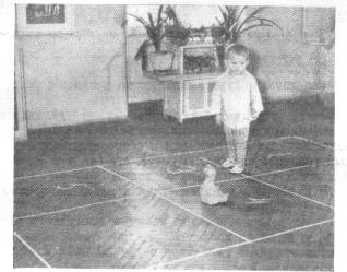 Великие русские физиологи И. М. Сеченов и И. П. Павлов придавали очень большое значение мышечным ощущениям, возникающим при артикуляции. Сеченов писал: «Мне даже кажется, что я никогда не думаю прямо словом, а всегда мышечными ощущениями» (СНОСКА: И. М. Сеченов. Избр. произведения. М.—Л., АН СССР, 1952, т. 1, стр. 87). Павлов также говорил, что речь — это прежде всего мышечные ощущения, которые идут от речевых органов в кору головного мозга. Поэтому в поисках того, что может помочь в развитии речи ребенка, прежде всего возникала мысль об использовании мышечных ощущений с речевого аппарата. Но как их вызывать? Мы уже знаем, что у маленьких детей звукоподражание возникает только в том случае, если ребенок видит мимику взрослого и воспроизводит ее. Но мы знаем и другое: к семимесячному возрасту имитация мимики у детей ослабевает, У годовалых и более старших детишек, запущенных в педагогическом отношении, получить нервные импульсы с органов артикуляции очень трудно. Следовательно, эта дверь остается закрытой, и нам нужно искать другую. Если внимательно посмотреть на карту головного мозга (см. рис. 6), то бросается в глаза, что двигательная речевая область расположена совсем рядом с двигательной областью, она является, собственно, ее частью. Может быть, развитие моторной речи зависит от развития общей моторики ребенка в целом? Рис. 43. Ребенок свободно передвигается по полу. Исходя из этого предположения, были проведены следующие наблюдения. В том же доме ребенка, о котором мы только что говорили, было отобрано 19 здоровых, но неговорящих детей в возрасте 1 года 1 месяца — 1 года 3 месяцев. Девяти из этих детей (будем называть их 1-й группой) была дана возможность ежедневно в течение 20 минут свободно передвигаться по полу (рис. 43, 44). Остальные 10 детей (2-я группа) находились в обычных условиях, т. е. период бодрствования проводили в манеже, где их движения были ограничены: куда бы ребенок ни пополз (или пошел), он натыкался па барьер или на других детей. В обеих группах ежедневно с каждым ребенком проводились двухминутные занятия по развитию речи, как это описывалось выше. |
