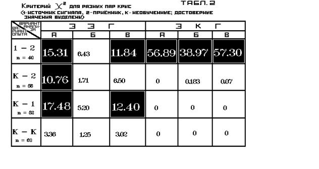 Стр. 67 Видно, что в половине экспериментов животные-индукторы, у которых вырабатывали условную реакцию избегания в ответ на световой сигнал, достаточно быстро научались. Животные-перципиенты, не получавшие такого сигнала, научались только реакции избавления, т.е. перебегали на безопасную половину челночной камеры только вследствие воздействия электрическим током. Случайные реакции избегания статистически недостоверны. Следовательно, нам не удалось наблюдать изменений поведения биообъекта при гипотетических воздействиях гипотетическими семантическими сигналами неясной природы. Однако, проверяя не менее фантастическую гипотезу путем очень быстрого уничтожения субстрата психики индуктора - мозга, - мы неожиданно получили результаты, пример которых (животные из той же серии, что и на рис.1) приведен в таблице 1. В табл.1. цифрой 1 обозначены животные-индукторы, цифрой 2 - перципиенты, буквой К - контрольные животные, не обучавшиеся в челночной камере. Расстояние между помещенными в заземленные экранированные камеры животными составляло 15 метров. Животные находились в состоянии миорелакциии, вызванной инъекцией тубокурарина, и получали ИВЛ. У животных группы 2 непрерывно регистрировали ЭЭГ и ЭКГ и вводили их в память информационно-вычислительного комплекса «Плюримат-С». В случайный интервал времени животным-индукторам предъявляли световую вспышку и сигнальное воздействие электрическим током. Через 0,5-1,0 сек включали СВЧ-поле для тотальной денатурации тканей. ЭЭГ и ЭКГ животных-перципиентов обрабатывали по вышеупомянутому статистическому алгоритму, представляющему собой несложную иерархию общепринятых методов. При этом введенный в компьютер через аналого-цифровой преобразователь исходный сигнал (ЭЭГ, ЭКГ)дискретизировали и разбивали на произвольное число эпох анализа до и после сигнальных или ноцицептивных воздействий на индуктора, после чего из полученных вариационных рядов вычисляли параметры Т-статистики ( среднюю арифметическую, дисперсию и пр.). Затем последовательно сравнивали параметры каждой эпохи с остальными и получали совокупность критериев Стьюдента и Фишера (рис.2). |