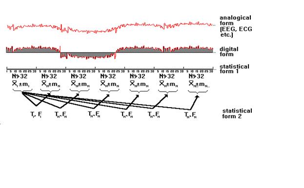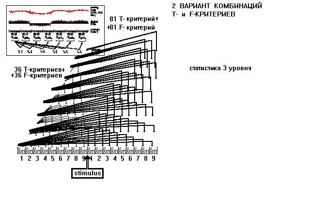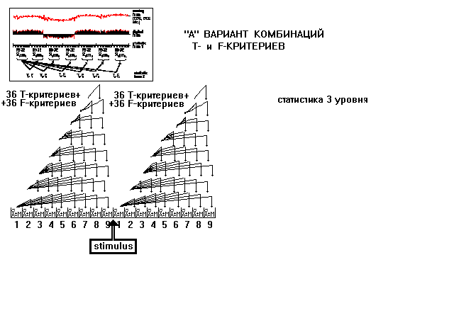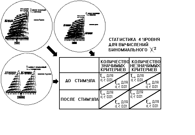 Стр. 68 Существует три варианта получения статистических Т- и F-критериев: А - когда они исчисляются путем перебора параметров произвольного числа эпох до воздействия («stimulus» на рис.3) и после воздействия; Б - когда они исчисляются при сравнении всех эпох до воздействия между собой и каждой из этих эпох с каждой эпохой после воздействия ( рис. 4); В - когда сравнивают все эпохи до воздействия между собой, все эпохи после воздействия между собой, и все эпохи до воздействия со всеми эпохами после воздействия (рис.5). Последним этапом алгоритма является вычисление непа раметрического и свободного от распределения критерия, например, биноминального критерия хи-квадрат (рис.6) Результаты, превышающие критические для альфа <О.01 значения, свидетельствуют о статистическом различии совокупности эпох до воздействия от совокупности эпох поcле воздействия. Характер и специфика различий при этом не учитывается. Описанная последовательность использования статистических методов была разработана и подробно исследована А.Б. Салтыковым применительно к самым разным типам исходного сигнала. Результаты испытаний показали высокую эффективность алгоритма при выделении любого сигнала из шума (при том условии, что исследователь не интересуется параметрами сигнала). Мы применяем этот алгоритм в различных процедурах, в том числе диагностических. Как видно из табл.1, чувствительность разных вариантов алгоритма неодинакова. Поэтому мы в своей работе использовали все три варианта. Какие же интерпретации можно получить по результатам этих экспериментов? Принято считать, что, поскольку вторая сигнальная система у животных отсутствует, они более ограничены в средствах коммуникации, чем человек. Из обзорных работ Е.Н. Панова и А.А. Никольского явствует, что животные располагают значительным тезаурусом сигналов, в т.ч. акустических, которыми они пользуются для коммуникаций. Вокализации животных в последнее время принято считать прототипом вербального языка человека. Однако психосемантические исследования на животных существенно затруднены из-за ограниченной доступности их семантических сигналов экспериментатору. Тем не менее, поскольку для решения поставленных задач требовалось установить диапазоны значимостей семантического стимула, условия его восприятия и консолидации, а также отдельные компоненты процесса импринтинга, мы предприняли традиционный прием: искусственно тем или иным путем придавали значимость либо простому физическому стимулу (вспышка света), либо всему комплексу физических сигналов биологического происхождения. Это в большинстве случаев достигалось оперантным (инструментальным) обучением в специально созданном компьютерном комплексе, который с применением адаптивного алгоритма, подстраивающего условия обучения под особенности научения каждого конкретного животного, в автоматическом режиме обеспечивал выработку инструментальной реакции побежки в челночной камере или моторно-вегетативную реакцию без побежки. Применяли как детерминированные условия обучения, так и специально изменяющиеся вероятностные условия обучения. Последние были предварительно моделированы методом «Монте-Карло» в 500 имитационных экспериментах на компьютере. При выработке указанных реакций всегда использовали одновременно пару или групп