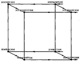 Стр. 201 Аналогично мюрмесинная — основное средство для достижения целей по мюрментанной и имментанной, иммесинная — вспомогательное средство для мюрментанной и имментанной, поддержка мюрмесинной. Тот же пример. Мюрмесинная (релэкзостатив) — создать себе авторитет, внедриться в систему, доказать свою нужность этой системе, и, в то же время, иммесинная (релэндостатив) — на всякий случай не портить отношения, а улучшать их, искать полезных людей и перетягивать их на свою сторону, но все это не главное — только если не поможет мюрмесинная функция, и, кроме того, постоянная поддержка для нее, крепкий тыл. Для реализации этой схемы необходимы все аналитико-синтетические связи кольца. Кроме того, при работе по достижению главной цели и цели поддержки возникают этакие «цели-минимум» и «средства-минимум» для их достижения, которые могут относиться к каким угодно двум функциям кольца (кроме функций одинаковой аналитичности — синтетичности) — так возникает необходимость обратного тока. В каждой аналитической есть элемент синтетичности и наоборот. В каждой сильной есть элемент слабости и т. д. Никуда не деться от диалектики. На практике не всегда стоит рассматривать работу модели «А». Результат таких выкладок будет довольно громоздким и неудобным. Однако полезно помнить о принципах действия этого макета, если вы хотите проследить работу психики в тонких деталях. Движение информации в кольцах отражено на рис. 5. Рис. 5. Функцион. Взаимодействие между кольцами Взаимосвязь эта основывается на принципе рамочности, но здесь его толкование немного шире, чем в случае аспектов. Витальные функции задают «рамки», за которые человек не может выйти. Пока мы остаемся «в рамках» — все в норме, но как только происходит выход, активность прекращается (Скажем, человек с сомэндодинамивом в мюрмесине будет веселить компанию в тех пределах, в которых позволяют его этические нормы — релэндостатив в мюрвисине.). Таким образом, разделение функций по ментальности — витальности совпадает с разделением аспектов по признаку статика — динамика. Этот факт позволяет графически обосновать все возможные способы образования соционических типов. Для этого построим функцион — куб из функций, построенный аналогично тому, как построен аспектон из аспектов. На его верхней грани могут располагаться либо только ментальные, либо только витальные функции. В расположенных друг рядом с другом вершинах находятся аналитическая с синтетической функцией. |