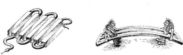 Стр. 57 АППЛИКАЦИЯВырежи из приложения на с. 131 части и наклей их на отдельный лист так, чтобы получилась вот такая пальма. РИСОВАНИЕ ПО ТОЧКАМСоедини точки, и у тебя получатся два замечательных рисунка. Кто это? ШУТКИ ПРОСТРАНСТВАЭто не задания для ребёнка, а возможность обратить его внимание на удивительные явления, которые есть вокруг нас. Одно из них — это рисунки с парадоксальным пространством. На этих страницах мы поместили любопытные рисунки. Посмотри на них внимательно! Сначала кажется, что всё правильно, но если приглядеться, то можно обнаружить, что так не бывает. Последи внимательно глазами за этой змейкой. Как ты думаешь, хвост и голова принадлежат одной и той же змее или двум разным? Интересную штуковину переносят эти ребята, не так ли? Как ты думаешь, горизонтальные линии на этих рисунках одинаковой длины или разной? Проверь себя с помощью линейки. И что ты обнаружишь? Фантастика, да и только. Есть такая поговорка: «Не верь глазам своим». А что ты видишь на этой картинке? Я вижу здесь два лица в профиль, а мой друг видит вазу. А ты что? А может быть, тебе удалось увидеть и то и другое? Интересно, как это три трубы незаметно превращаются в две? |