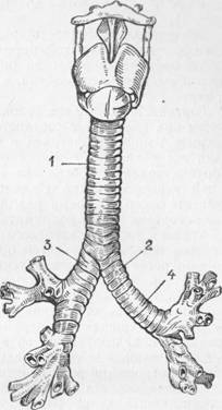 Стр. 5 Легкие имеют три поверхности: наружную, или реберную, внутреннюю, или средостенную, и нижнюю, или диафрагмальную. Расширение грудной клетки наступает в результате сокращения вдыхательных межреберных мышц, опущения и уплощения купола диафрагмы, что влечет за собой расширение легких и заполнение их воздухом. При сокращении выдыхательных межреберных мышц грудная клетка уменьшается в размерах, диафрагма расслабляется, объем легочной ткани уменьшается, так как наступает эвакуация воздуха из легких. Газообмен осуществляется в легочных пузырьках или альвеолах. В их стенках имеется хорошо развитая сеть кровеносных сосудов. В силу разности давления через альвеолярно-капиллярную перепонку в обе стороны проникают кислород, углекислота, а также другие вещества. В связи с этим легкие являются не только органом дыхания, но и выделения, а также осуществляют регуляцию определенной для организма температуры. Трахея представляет собой цилиндрическую трубку, состоящую из 16—20 гиалиновых хрящевых колец, имеющих форму открытой сзади подковы. Длина трахеи 11 — 13 см. Сзади она прилегает к пищеводу. Трахея является продолжением гортани книзу. Начинается она на уровне VII шейного позвонка, спускается в грудную полость и на уровне IV—V грудных позвонков делится па правый и левый бронхи. Трахея участвует в проведении воздуха и голосообразовании. В ней происходит дальнейшее согревание вдыхаемого воздуха и очищение его от пыли. Рис. 1. Бронхи, трахея, гортань. 1 — трахея; 2 — бифурка ция; 3 — правый бронх; 4 — левый бронх. Бронхи имеют строение, аналогичное трахее, состоят из эластичной, легко растяжимой ткани. Правый бронх шире, короче, чем левый, и является как бы продолжением трахеи. Два основных бронха делятся на бронхи первого, второго, третьегопорядка и т. д. вплоть до мельчайших веточек — бронхиол (рис. 1). Внутренняя поверхность трахеи и бронхов выстлана слизистой оболочкой, покрытой мерцательным эпителием. Таким образом бронхиальное дерево осуществляет проведение вдыхаемого и выдыхаемого воздуха, а альвеолярное участвует в газообмене. |