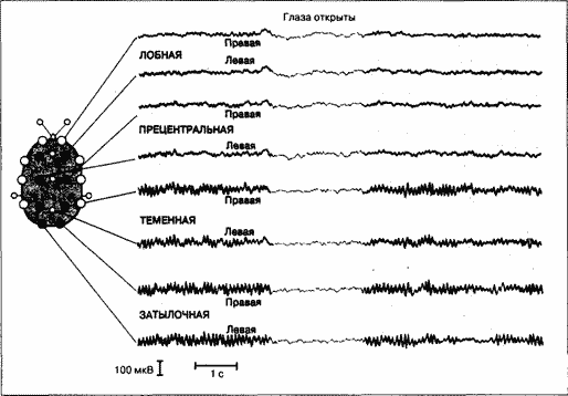 Стр. 24 Парадоксальный сон, в отличие от медленно-волнового, характеризуется резким усилением вегетативных реакций (вегетативные бури), наличием быстрых движений глаз и ярких, эмоционально окрашенных сновидений. Физиологическая значимость парадоксального сна состоит в том, что происходит своеобразная «разрядка», освобождение коры больших полушарий от информационной нагрузки, эмоционального напряжения и создаются оптимальные условия для предстоящей деятельности. Таким образом, сон - неоднородный процесс высокой функциональной значимости. От его продолжительности, выраженности и соотношения двух основных видов - медленного и парадоксального сна - существенно зависит функциональное состояние человека, его работоспособность, умственная деятельность и эмоциональный фон. При нарушениях сна или его длительном отсутствии снижается скорость реакций, нарушается внимание, наступает быстрая утомляемость при умственной работе, нарастает раздражительность. Состояние спокойного бодрствованияБодрствование является тем функциональным состоянием, на фоне которого разворачивается любая психическая деятельность. Значимость этого состояния для обеспечения эффективности деятельности при ее оптимальной физиологической стоимости чрезвычайно велика. Состояние бодрствования не является однородным. В нем выделяются активное бодрствование и спокойное бодрствование. В состоянии спокойного бодрствования у взрослого человека регистрируется синхронизированный ритм с частотой 8-13 Гц (среднее значение 10 Гц). Он максимально выражен в покое с закрытыми глазами и блокируется при открывании глаз (рис. 9). Степень выраженности альфа-ритма различается у разных людей. В норме по выраженности альфа-ритма выделяют несколько типов ЭЭГ, отражающих индивидуальную организацию нервных процессов, большую или меньшую активированность коры больших полушарий и особенности ее взаимодействия с подкорковыми структурами. |
