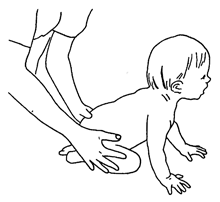 Стр. 86 3. Раскачивание в позиции ползания. Не забудьте, что раскачивать корпус малыша можно только из стороны в сторону и по диагонали; раскачиваться вперед-назад он научится сам. Как располагаться, как носить малыша, как игратьВ этом случае, как и во многих других, описанный ранее способ опускания малыша на пол очень полезен. С его помощью удобно учить ребенка принимать положение для ползания. Каждый раз, когда вы снимаете малыша с рук, опускайте его так, как рассказано в параграфе ОМ.А.30, после чего переводите в позицию для ползания. Сначала следует оставлять ребенка в этом положении на несколько секунд, но со временем этот интервал можно увеличивать. Вскоре при желании можно будет попробовать поворачивать спину ребенка для перехода в позицию “сидя боком”. Рис. 21. Верните ребенка в положение “сидя боком” ОМ.А.40 Из положения для ползания перемещается в положение сидяЗдесь мы еще раз убедимся, насколько важно для ребенка научиться переносить вес тела на один бок, в процессе чего этот бок как бы удлиняется, а другой укорачивается. Попробуйте сами принять положение для ползания и последите за тем, что происходит, когда вы переходите в положение сидя. |