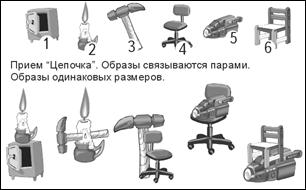 Стр. 151 Прием "Цепочка"При запоминании приемом «Цепочка» образы связываются парами. Относительные размеры образов в каждой паре одинаковые - большие. В каждой паре образов необходимо четко различать первый и второй образ пары. Второй образ пары проникает в первый. Второй образ пары находится сверху. Второй образ пары находится справа. Применение Этот прием применяется для формирования коротких последовательностей опорных (стимулирующих) образов. Последовательность образов хорошо закрепляется путем многократного припоминания и используется для формирования систем опорных образов в комбинациях с другими методами запоминания последовательности. Длинные последовательности образов в системе "Джордано" не используются. Так как любая длинная последовательность будет разрушена со временем ("Эффект стирания связей"). От длинной последовательности связей в мозге сохраняются лишь первые и последние элементы. Даже тогда, когда после запоминания последовательность воспроизводится безошибочно и полностью. Запоминание длинной последовательности образов приемом «Цепочка» может использоваться при выполнении тренировочных упражнений, когда длительная сохранность связей не важна. В этом случае количество связываемых образов практически не ограничено - можно связать десятки и даже сотни образов. |