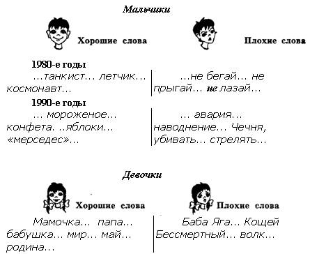Стр. 83 «Ассоциативный» экспериментРис. 24. Дети 6-7 лет свободно называют слова, которые считают «плохими» или «хорошими». Для схемы отобраны слова, подчеркивающие выявленные тенденции. Свободные ассоциации показывают, что социальные изменения в обществе отразились на шкале ценностей 6-7-летних детей (в первую очередь мальчиков). В эксперименте участвовали дети Ленинграда — С.-Петербурга из благополучных семей. Вот примеры. Миша, 6 лет. Хорошие слова: мороженое, конфета, яблоки, груши, ананасы, киви, бананы. Другой мальчик — Стас, 7 лет — хорошими называет слова: суп грибной, шоколад, орехи, горох, конфеты, жвачки, мороженое, машины, «мерседес», свадьба. А вот плохие: черт, боль, убит, войска, стрелять, убивать, танк, Чечня. А вот Алеша, 6 лет, хорошими считает слова: мороженое, пирожное, сыр, колбаса, сосиски, майонез, пожалуйста, спасибо, на здоровье. Плохие: авария, наводнение, землетрясение, поток, плохой, нехороший, грабить, стрелять, банда. Андрей, 7 лет; хорошие слова: мороженое, жвачки, пирожное, пироги, торт, пирожки, трубочки, шоколад. А плохие слова: кошмары, ужасы, привидения, убийца, кража, плохо, когда наказывают. Следует подчеркнуть, что эти мальчики из весьма благополучных, хорошо обеспеченных семей. У них развито творческое мышление, высока способность к комбинированию образов, а главное, мальчики имеют высокий балл общего речевого развития. Особый интерес вызвало обобщение негативных ассоциаций. У мальчиков они отражают криминальные проявления в обществе: война, зло, преступники, бандиты, стрелять, убить, Чечня, жечь, грабить, воры, кровь,— чего раньше, еще несколько лет назад, не наблюдалось в ассоциациях у мальчиков этого возраста. Также назывались герои мультфильмов и фильмов ужасов. У девочек чаще всего отрицательными являлись герои сказок: Баба Яга, Кощей Бессмертный, дракон, чудовища, динозавры и многие животные — тигр, змея, волк, медведь, а также герои мультфильмов и фильмов ужасов. Криминальные слова попадали в число «плохих» значительно реже, чем у мальчиков. |